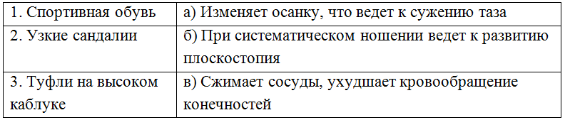 5. (6 баллов) Девочка Света вместе с бабушкой отправились в обувной магазин, чтобы приобрести к школе повседневную обувь. Света выбрала три варианта, которые ей понравились: а) спортивная обувь, б) узкие сандалии, в) туфли на высоком каблуке. Бабушка осталась недовольна выбором внучки. Помогите бабушке объяснить, почему выбранная Светой обувь не рекомендована для ее возраста. Ответ запишите в виде комбинации цифр и букв без пробелов и каких-либо знаков препинания, цифры должны идти по порядку, например 1а2г3в