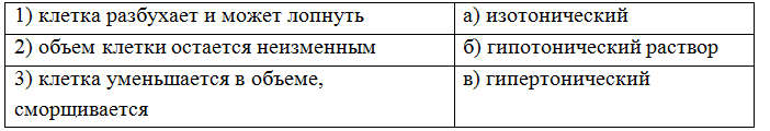 5. (6 баллов) Соотнесите изменения объёма клетки при погружении её в разные виды растворов. Ответ запишите в виде комбинации цифр и букв без пробелов и каких-либо знаков препинания, цифры должны идти по порядку, например 1в2а3б