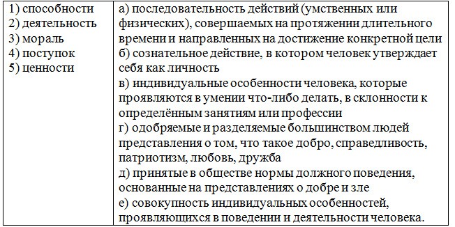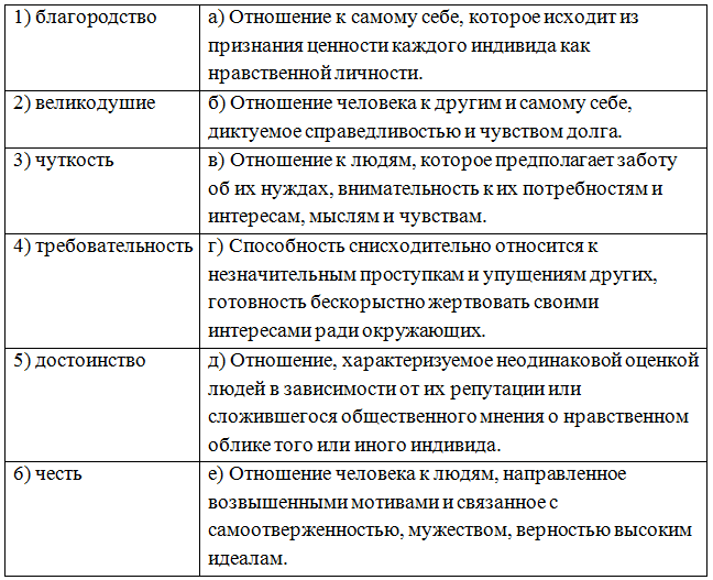 7. (8 баллов) Установите соответствие между нравственными качествами личности и их характеристиками. Ответ запишите в виде комбинации цифр и букв без пробелов, без кавычек и каких-либо знаков препинания, цифры должны идти по порядку, например, 1а2г3в