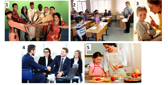 4. (2 балла) Помогите Диме определить его социальную роль, когда он дома с родителями, когда находится на занятиях в школе, когда забегает после уроков в магазин купить булочки. Выберите из представленного перечня социальных ролей нужные и соотнесите их с иллюстрациями. Ответ запишите в виде комбинации цифр и букв без пробелов и каких-либо знаков препинания, цифры должны идти по порядку, например, 1а2в3б