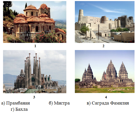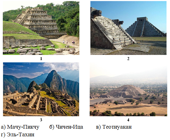 6. (4 балла) Соотнесите названия археологических объектов с их изображением. Ответ запишите в виде комбинации цифр и букв без каких-либо знаков препинания и пробелов, цифры должны идти по порядку, например, 1а2в3б4г