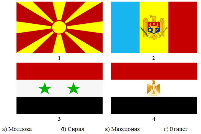 9. (5 баллов) Установите соответствие: флаг – страна. Ответ запишите в виде комбинации цифр и букв без каких-либо знаков препинания и пробелов, цифры должны идти по порядку, например, 1а2в3б4д