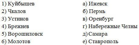 5. (4 балла) Установите соответствие: старое название города – современное. Ответ запишите в виде комбинации цифр и букв без каких-либо знаков препинания и пробелов, цифры должны идти по порядку, например, 1а2в3б4д