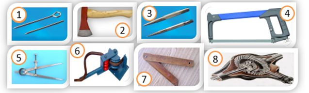 8. (5 баллов) Среди изображений выберите разметочные, столярные, слесарные инструменты и механизмы. Ответ запишите в виде последовательности цифр и букв без пробелов и каких-либо знаков препинания, располагая цифры в порядке возрастания, а буквы, стоящие за ними в алфавитном порядке, например, 1абвг2дежз