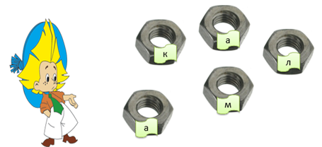 2. (3 балла) Помогите Незнайке разложить гайки так, чтобы получилось слово, которое обозначает крепёжное изделие в виде цилиндрического стержня с фасками или закругленными концами. Запишите полученное слово в ответе без знаков препинания.