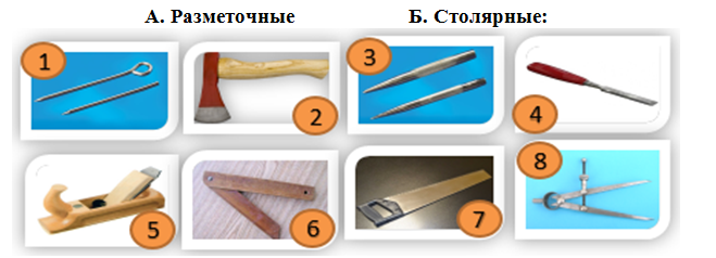 1. (3 балла) Среди изображений выберите разметочные и столярные инструменты. Ответ запишите в виде последовательности букв и цифр без пробелов и каких-либо знаков препинания, располагая буквы в алфавитном порядке, а цифры, стоящие за ними, в порядке возрастания, например, А1234Б5678