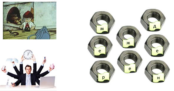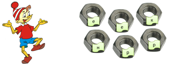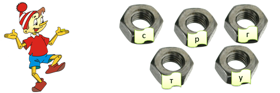 3. (3 балла) Помогите Буратино разложить гайки так, чтобы получилось слово, которое обозначает ручной инструмент для грубой обработки древесины строганием (рубанок, фуганок). Запишите полученное слово в ответе без знаков препинания.