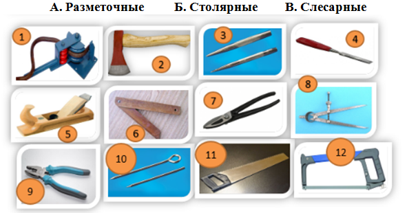 6. (4 балла) Среди изображений выберите разметочные, столярные и слесарные инструменты. Ответ запишите в виде последовательности букв и цифр без пробелов и каких-либо знаков препинания, располагая буквы в алфавитном порядке, а цифры, стоящие за ними, в порядке возрастания, например, А1234Б5678В9101112
