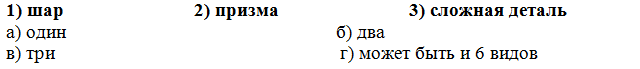 4. (4 балла) Сколько видов проекции необходимо для построения чертежа шара, призмы, сложной детали? Ответ запишите в виде сочетания цифр и букв без пробелов и каких-либо знаков препинания и пробелов, цифры должны идти по порядку, например, 1а2б3в