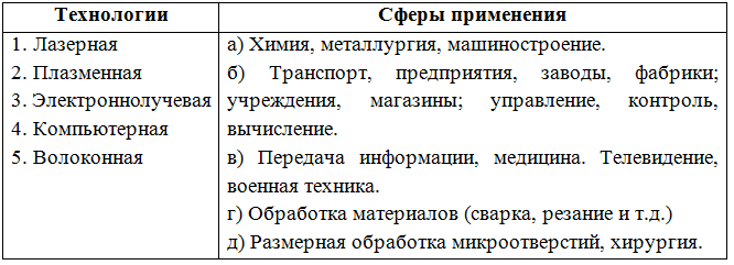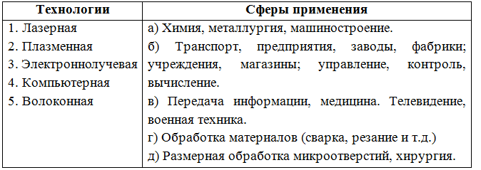 9. (5 баллов) Найдите в правой колонке таблицы основные сферы применения технологий, названные в левой таблице. Ответ запишите в виде сочетания цифр и букв без пробелов и каких-либо знаков препинания и пробелов, цифры должны идти по порядку, например, 1а2б3в