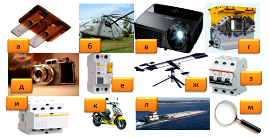 8. (5 баллов) Среди изображений выберите машины, оптические приборы и коммутационные аппараты. Ответ запишите в виде последовательности цифр и букв без пробелов и каких-либо знаков препинания, располагая цифры в порядке возрастания, а буквы, стоящие за ними в алфавитном порядке, например, 1абвг2дежз