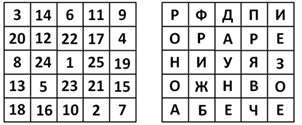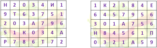 6. (по 2 балла за каждый пункт) Найди в таблицах среди чисел буквы. Составь из низ слова. В каждой таблице находится по одному слову.