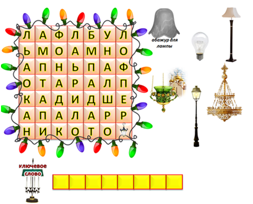 10. (5 баллов) Найдите в филворде названия осветительных приборов, которые размещены справа от таблицы. Слова могут изгибаться как угодно, но по диагонали двигаться нельзя. Выпишите оставшиеся буквы слева направо и составьте из них ключевое слово – название светильника 18-19 вв., который использовался для карточных игр (порядок букв менять нельзя). В ответе запишите полученное слово без каких-либо знаков препинания и пробелов.
