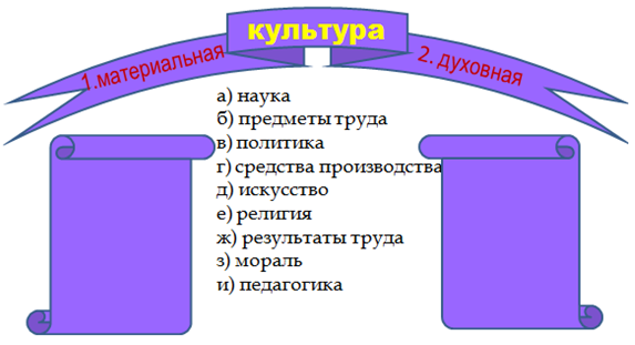 6. (4 балла) Определите, что относится к материальной культуре и к духовной культуре. Ответ запишите в виде комбинации цифр и букв без пробелов и каких-либо знаков препинания, располагая цифры в порядке возрастания, а буквы, стоящие под одной цифрой, в алфавитном порядке. Например, 1абв2где