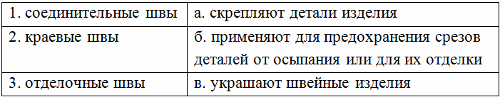 1. (3 балла) Установи соответствие между названиями машинных швов и их описанием. Ответ запиши в виде комбинации цифр и букв без кавычек и каких-либо знаков препинания, цифры должны идти по порядку, например: 1б2а