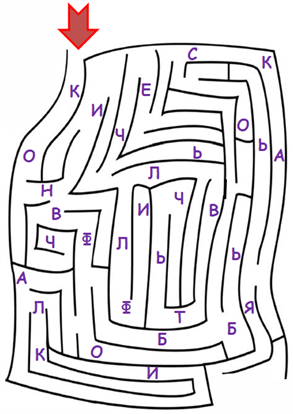 6. (по 2 балла за каждый пункт) Найди выход из лабиринта. На пути к выходу собери все буквы по порядку.