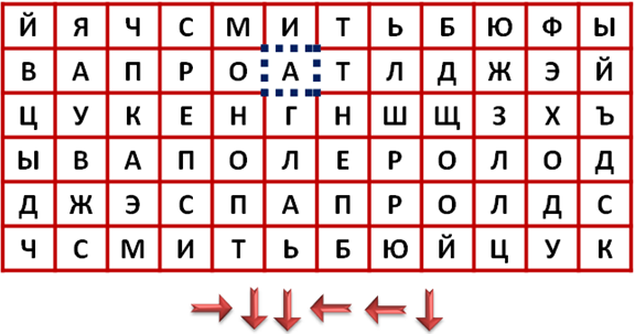 Традиционная *** приготавливается замешиванием кукурузной муки с водой в большом медном котле, затем она мешается деревянной ложкой в течение 40 минут или пока она не загустеет достаточно, чтобы держаться на ложке. Затем остужается в круглом подносе, разрезается на кусочки и подаётся на стол. Обычно употребляется как гарнир или в качестве самостоятельного блюда с различными добавками (грибами, мясом). Чтобы узнать название этого блюда, двигайся по указанным стрелкам, начиная от выделенной клеточки. Собери по порядку все буквы и запиши их в один ряд. Прочти слово справа налево.