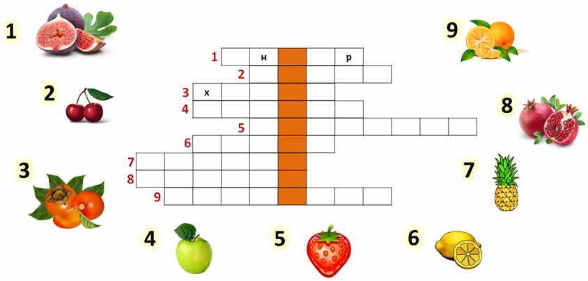 Чтобы узнать название этой ягоды и растения, разгадай кроссворд. Впиши названия фруктов и ягод и в выделенном столбце прочти название.