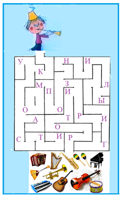 10. (5 баллов) Помоги Дударику пройти через лабиринт и забрать музыкальные инструменты. На пути собери все буквы по порядку, и получишь слово.