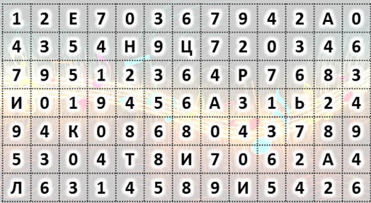 6. (по 2 балла за каждый пункт) Найди в таблице среди чисел буквы. Собери из них два слова.
