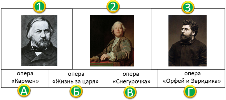 10. (5 баллов) Установи соответствие между фамилиями композиторов и героями их произведений. Ответ запиши в виде комбинации цифр и букв без пробелов и каких-либо знаков препинания, цифры должны идти по порядку. Например, 1б2г3в4а