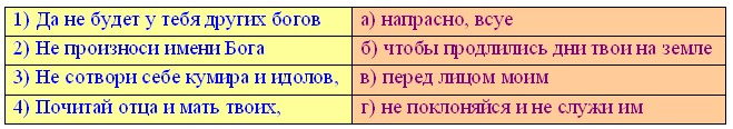 3. (5 баллов) Соедини заповеди-законы, записанные на каменных скрижалях, которые Бог вручил Моисею. Ответ запиши в виде комбинации цифр и букв без пробелов и каких-либо знаков препинания, цифры должны идти по порядку, например, 1г2б3в4а