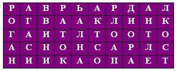 7. (6 баллов) Найди в таблице имена выдающихся деятелей эпохи Возрождении. Слова могут изгибаться как угодно, но по диагонали двигаться нельзя.