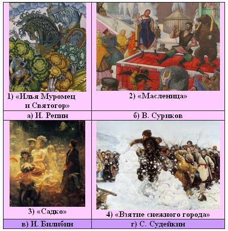 4. (6 баллов) Соедини художников с их картинами. Ответ запиши в виде комбинации цифр и букв без пробелов и каких-либо знаков препинания, цифры должны идти по порядку, например, 1г2б3в4а