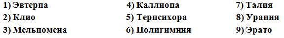 10. (8 баллов) Вставь имена муз в текст в правильной последовательности. Ответ запиши в виде ряда цифр без пробелов и каких-либо знаков препинания, например, 1346