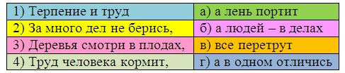 2. (4 балла) Собери пословицы. Ответ запиши в виде комбинации цифр и букв без пробелов и каких-либо знаков препинания, цифры должны идти по порядку, например, 1б2а3в4г