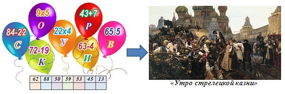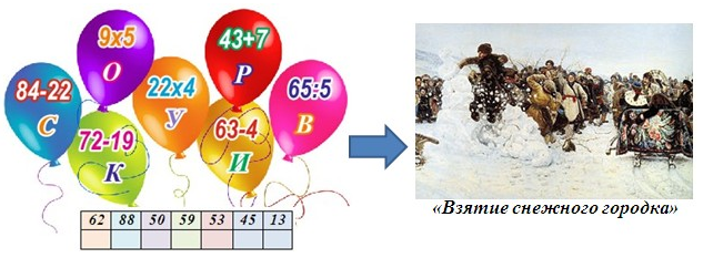 2. (3 балла) Реши примеры, вставь буквы в ячейки с соответствующими решениями и узнаешь фамилию автора этой картины. Запиши в ответе только фамилию без кавычек и каких-либо знаков препинания.