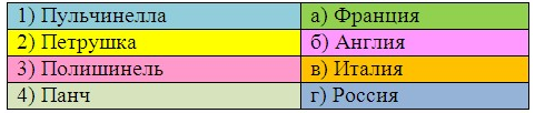 4. (5 баллов) Соедини имена героев кукольных театров мира и страны, где они популярны. Ответ запиши в виде комбинации цифр и букв без пробелов и каких-либо знаков препинания, цифры должны идти по порядку, например, 1б2а3в4г