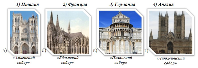9. (8 баллов) Соедини изображения соборов и их месторасположения. Ответ запиши в виде комбинации цифр и букв без пробелов и каких-либо знаков препинания, цифры должны идти по порядку, например, 1б2а3в4г