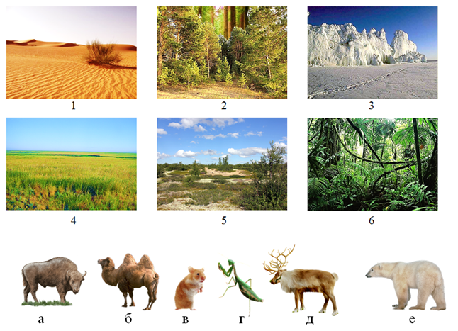 7. (4 балла) Помоги животным найти свою природную зону. Ответ запиши сочетанием цифр и букв без пробелов и знаков препинания. Цифры должны располагаться в порядке возрастания, например, 1г2а3б
