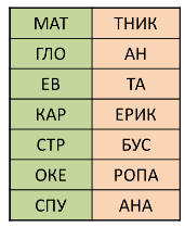 6. (3 балла) Для начала слова из первой колонки найди подходящую вторую часть во второй колонке. Какое из предложенных слов не связано с остальными общей темой? Запиши это слово в ответе.