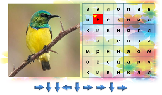 5. (4 балла) В таблице с буквами зашифровано название птицы, которая изображена на рисунке. Чтобы узнать название этой птички, двигайся по указанным стрелкам в таблице, начиная с выделенной клеточки. Запиши в ответе только полученное слово.