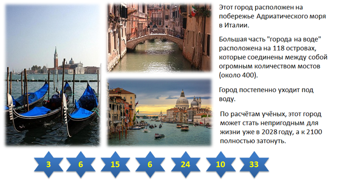 6. (4 балла) Рассмотри фотографии одного из городов и прочитай его описание. Чтобы узнать название данного города, запиши вместо чисел буквы. Указанные числа означают место буквы в русском алфавите. Запиши полученное слово в ответе.