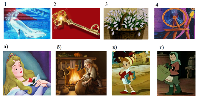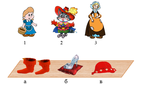 1. (1 балл) Герои сказок Ш. Перро потеряли свои вещи. Подбери каждому герою его вещь. Выбери правильное сочетание цифр и букв.
