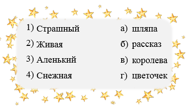 4. (2 балла) Установи соответствие между началом и концом названий литературных произведений. Ответ запиши в виде комбинации цифр и букв без пробелов и каких-либо знаков препинания. Цифры должны идти по порядку, например, 1а2г3в