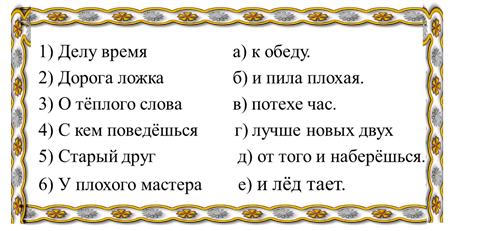 9. (5 баллов) Установи соответствие между началом и концом пословиц. Ответ запиши в виде комбинации цифр и букв без пробелов и каких-либо знаков препинания. Цифры должны идти по порядку, например, 1а2г3в