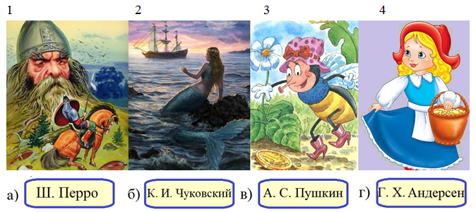 9. (5 баллов) Сопоставь сказочного героя с его автором. Ответ запиши в виде комбинации цифр и букв без пробелов и каких-либо знаков препинания, цифры должны идти по порядку. Например, 1б2а3г4в