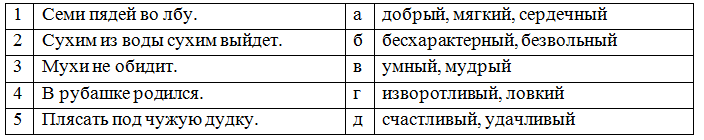 7. (4 балла) Наш мудрый народ сложил пословицы, поговорки, загадки и песни. Прочитайте поговорки о людях в левом столбце, соотнесите их с подходящими значениями из правого столбика.