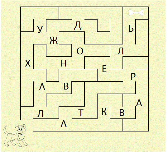4. (4 балла) Помоги Жучке добраться до косточки. По пути собери слово по буквам. В ответе укажи его без пробелов и знаков препинания.