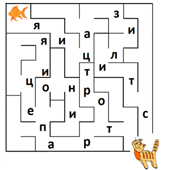 9. (5 баллов) Помоги коту Кузе добраться до рыбки. По пути собери слово по буквам. В ответе укажи его без пробелов и знаков препинания.