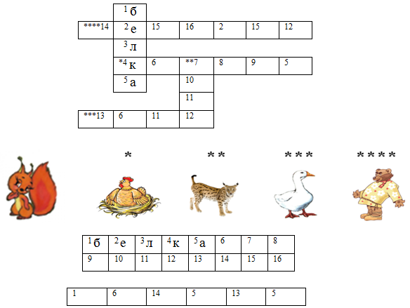 10. (10 баллов) Разгадай ключворд. Поставь вместо цифр буквы, используя слово-подсказку и рисунки-подсказки на месте звездочек. Каждой цифре соответствует одна буква, которую следует занести в верхнюю ленту букв. Из полученных букв в нижней ленте букв составь слово – название материала, из которого можно сделать аппликации. Запиши полученное слово в ответе без кавычек и каких-либо знаков препинания.