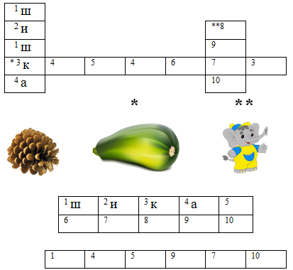 10. (10 баллов) Разгадай ключворд. Поставь вместо цифр буквы, используя слово-подсказку и рисунки-подсказки на месте звездочек. Каждой цифре соответствует одна буква, которую следует занести в верхнюю ленту букв. Из полученных букв в нижней ленте букв составь слово – название образца для изготовления объёмных изделий. Запиши полученное слово в ответе без кавычек и каких-либо знаков препинания.