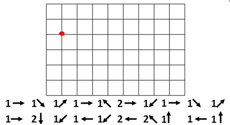 9. (5 баллов) Выполни графический диктант. Для этого, начиная от точки на листе, проведи линии по клеточкам. Количество клеточек, через которые нужно провести линии, указывает цифра, а направление линии (вправо, влево, вниз, вверх, наискосок) – стрелочки. Например, запись