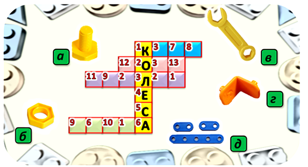 10. (5 баллов) Разгадай цифровой кроссворд. Для этого впиши в него названия деталей конструктора, которые изображены на картинке. Найти местоположение каждого слова поможет слово-подсказка, написанное в кроссворде.