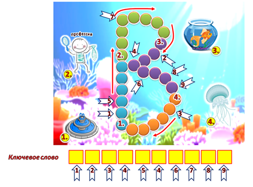 10. (5 баллов) Впиши в кроссворд названия картинок, пронумерованных от 1 до 4. Направление букв указано красными стрелочками. В каждом кружочке должна стоять одна буква. Буквы в кружочках, на которые указывают белые стрелочки, выпиши в отдельную строчку. У тебя получится ключевое слово. Какое? В ответе укажи только полученное слово без каких-либо знаков препинания, например, рыбка