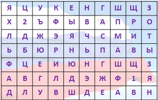 В этот день в Кремле президент России вручает Государственные премии. В Москве на Красной площади проходят торжества, которые оканчиваются праздничным салютом. Среди множества букв найди 2 цифры и название месяца. Слово может изгибаться как угодно.